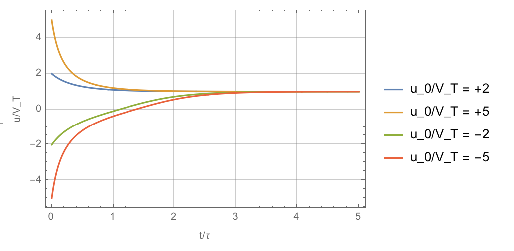 and since these dont have a nice analytic solution, I plotted them numerically for two cases, and we can see that the rocket reaches apogee in about t/tau = 1~2, and that the peak loads are similar to before, we only need to think about the magnitude of u_0/V_T.
