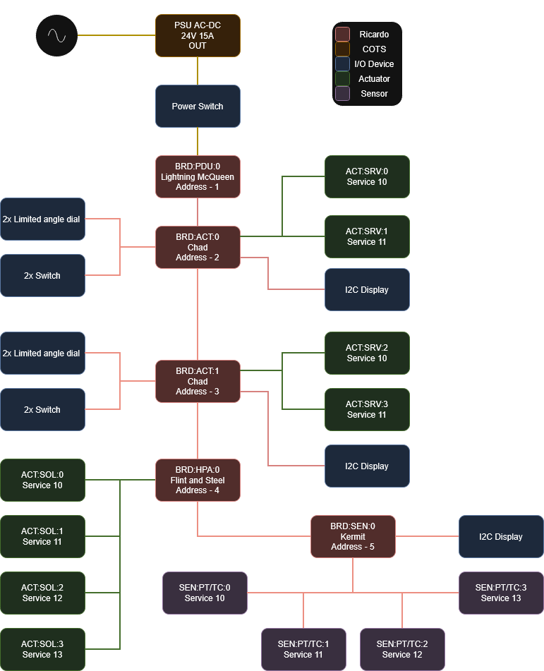 Diagram should show how all of these features work and how each component is driven. Check out Flint and Steel and Chad for solenoid and servo control respectively. Assume that the servos and solenoids are compatable with these boards. Also, check Kermit for control over the pressure transducers.