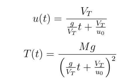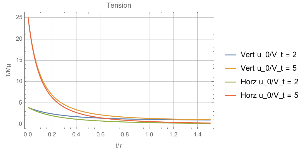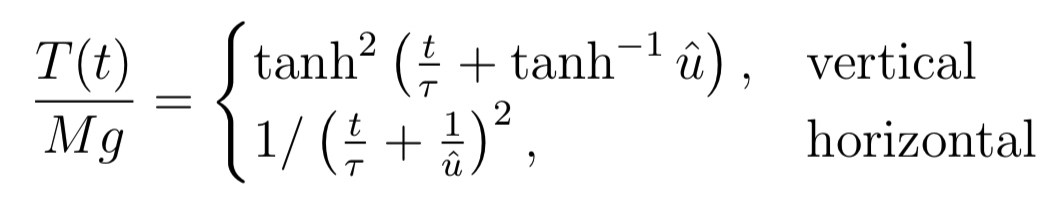 where tau is some sort of decay constant (which isn't dependent on the deployment speed (u_0), but only on the terminal speed), and u hat is the relative deployment speed. Therefore, the tension in the ropes is given by