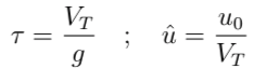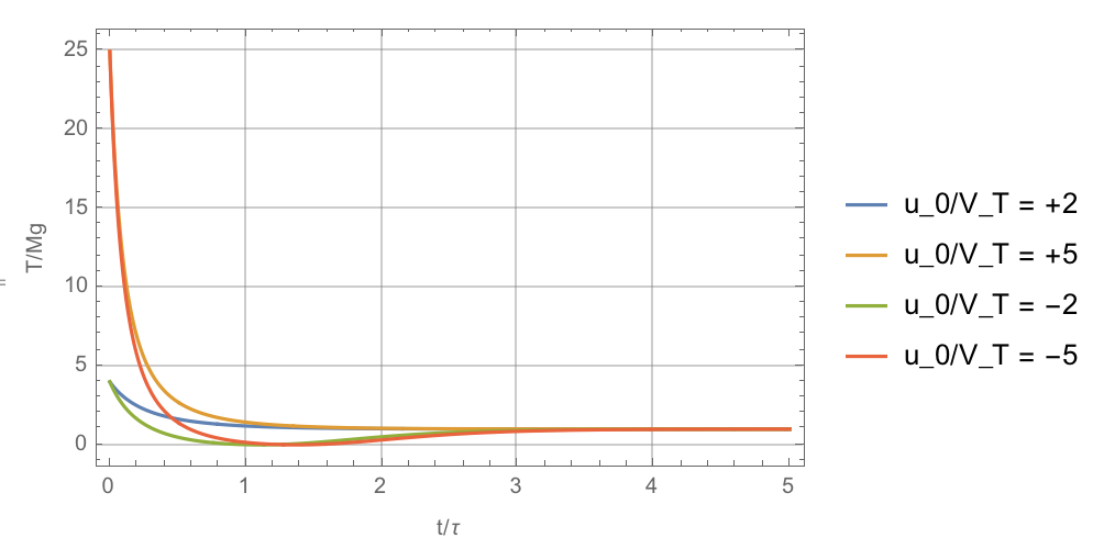 and since these dont have a nice analytic solution, I plotted them numerically for two cases, and we can see that the rocket reaches apogee in about t/tau = 1~2, and that the peak loads are similar to before, we only need to think about the magnitude of u_0/V_T.