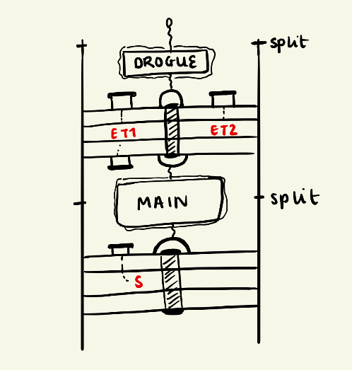 The situation has now become a three-body problem, with two different and separate drag forces (Dm and Dd) on the (main and drogue) chutes, and three masses (M1 - nose cone, M2 - connector, M3 - rest of the rocket) connected by shock cords (tensions denoted T1-4). The slanted shock cords are exaggerated - the actual situation would be much closer to vertical.