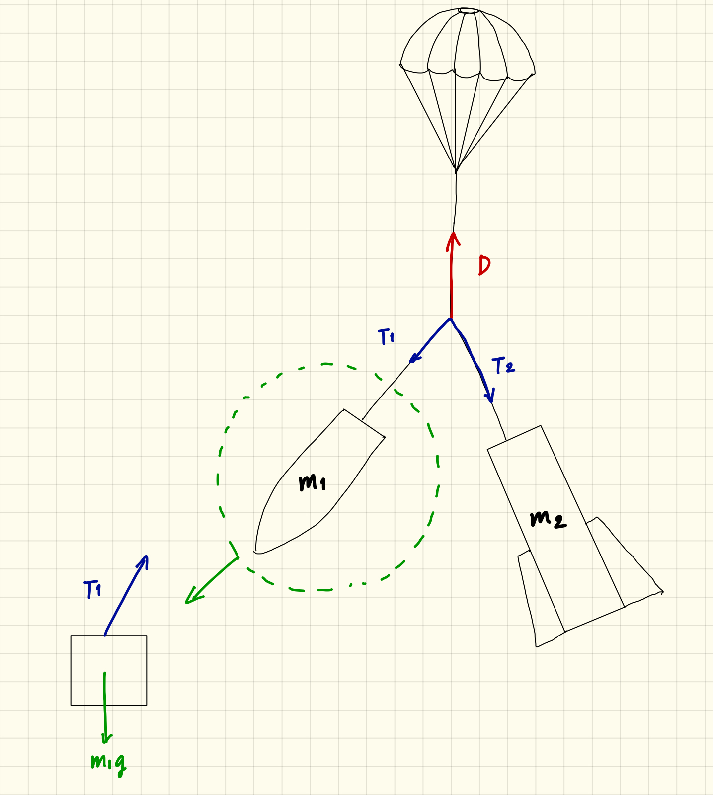 The drag D from the parachute is the shock load, and these are divided into tension forces T1 and T2.