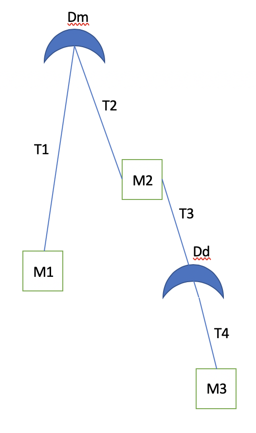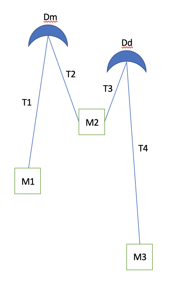 The tension in the four cords are solved for analytically as above, and we can recognise T3, if we assume M3 >> m1+m2 and Dm >> Dd, would be negative. That means the chord can not be taut, and we instead have a situation like below,